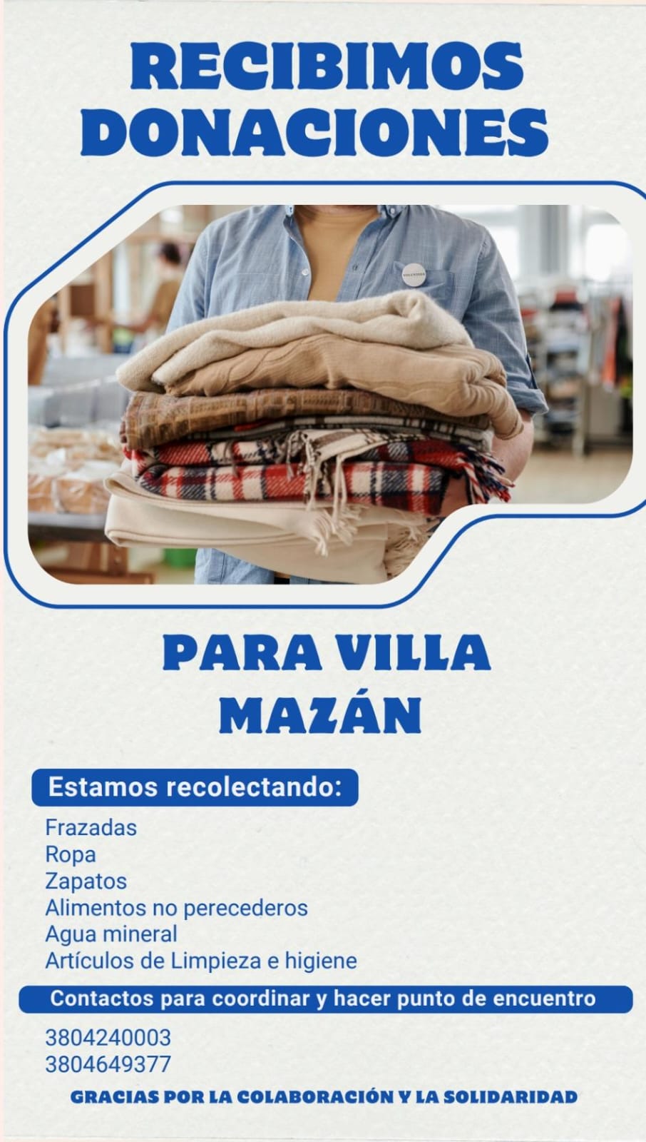 También estamos recibiendo donaciones para las familias afectadas por las inundaciones en Villa Mazán