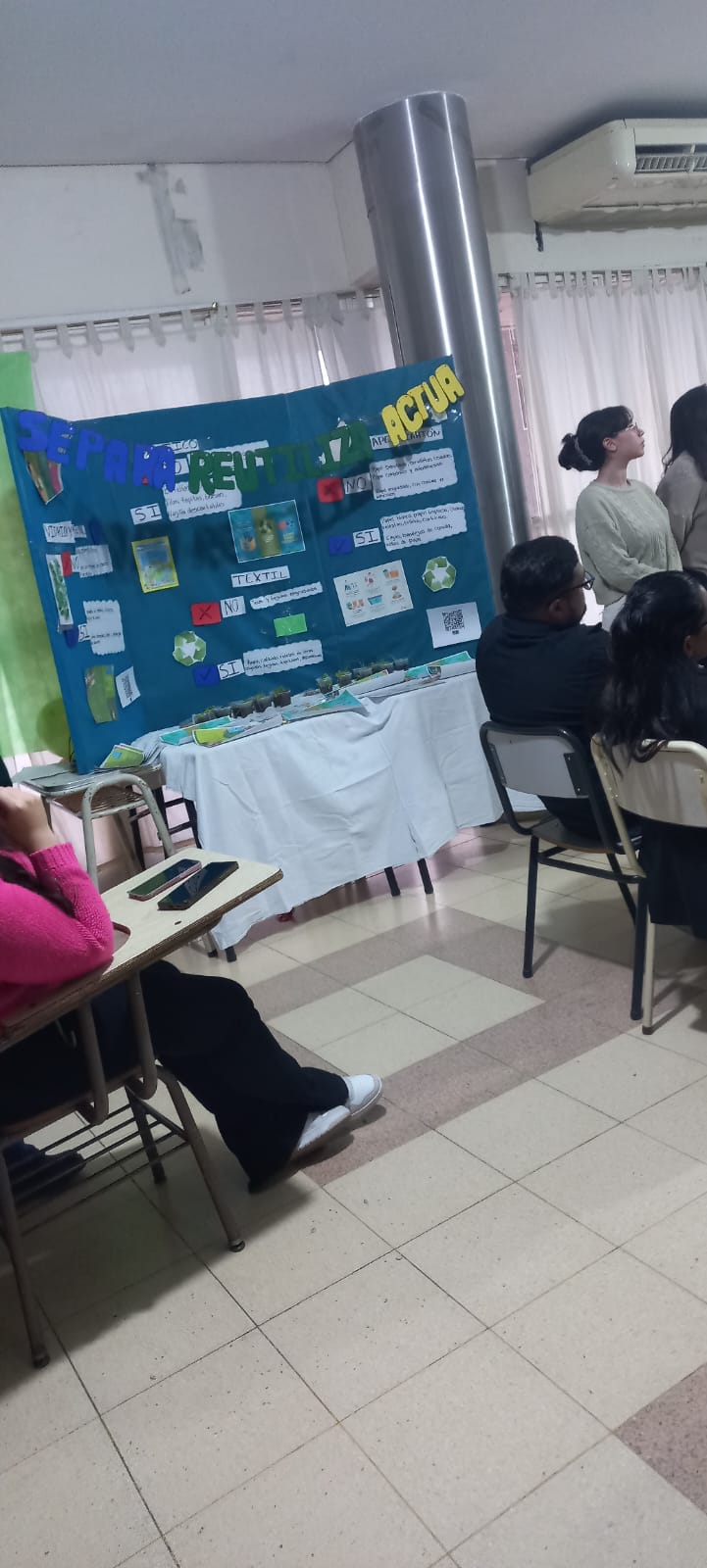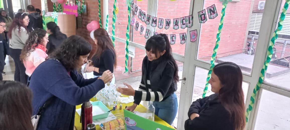 A la mañana, la actividad estuvo coordinada por la Prof. Carla González Banegas y los estudiantes de 4º año del Profesorado de Química, quienes trabajaron la clasificación de los residuos y experimentos con materiales orgánicos.
