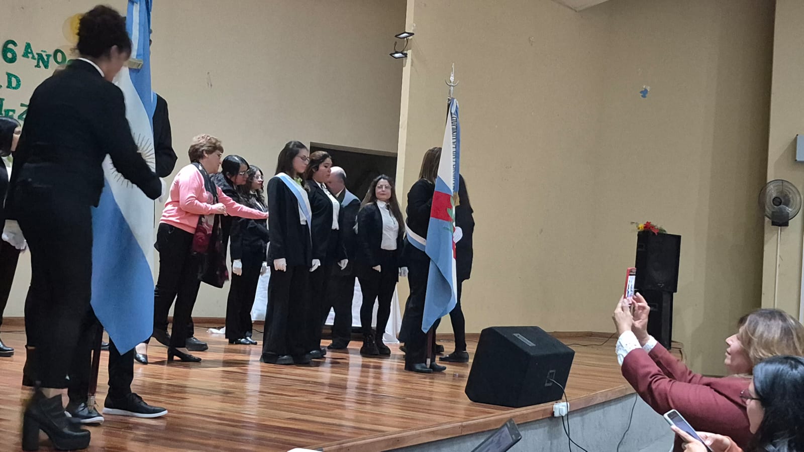 La ceremonia de traspaso, momento cúlmine del acto, fue realizada por la Sra. Rectora Lic. Claudia Ayán y el Sr. Vicerrector Lic. Mariano Simes Martini, quienes colocaron el tahalí a los nuevos abanderados. La comunidad presente acompañó este significativo traspaso con un gran aplauso.