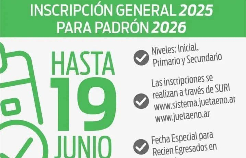 La Juetaeno informó que el llamado a inscripción general anual 2025 para el padrón 2026 estuvo abierto desde el 21 de abril y cierra el 19 de junio.